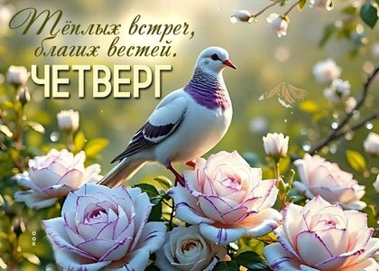 Красивая поздравительная открытка к четвергу с изображением белого голубя, сидящего на пышных розовых розах. На фоне — мягкий солнечный свет и нежные цветы. Сверху нанесена надпись на русском языке: «Тёплых встреч, благих вестей. Четверг». Изображение выполнено в светлых, пастельных тонах, создавая атмосферу уюта, мира и спокойствия. Идеально подходит для отправки в мессенджерах и социальных сетях для пожелания доброго утра или хорошего дня.