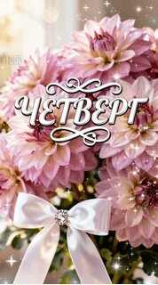 Красивая и нежная поздравительная открытка с изображением пышных розовых георгинов. На переднем плане расположена элегантная белая атласная лента с блестящей брошью в центре. На фоне цветов расположена стильная надпись «Четверг», выполненная каллиграфическим шрифтом с декоративными завитками. Изображение дополнено магическим эффектом мерцающих звезд и искр, создающих праздничное и светлое настроение. Идеально подходит для отправки в мессенджерах и социальных сетях для пожелания доброго четверга близким и друзьям.