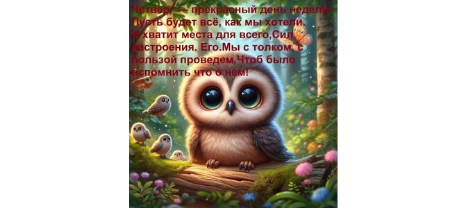 Теги:четверг прекрасный день недели пусть будет всё, как, хотели, хватит, места, для, всего, сил, настроения его мы с толком, с пользой проведем, чтоб было вспомнить что о нем