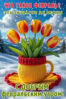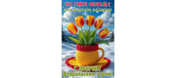 Открытка "ЧТО ТАКОЕ ФЕВРАЛЬ? ЭТО 28 ШАГОВ ДО ВЕСНЫ! С ДОБРЫМ ФЕВРАЛЬСКИМ УТРОМ!"
