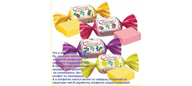 Теги:что у вас сегодня на обед ну, конечно, килограмм конфет к конфеткам заварите сладенький чаёк, в прекрасном настроении пройдет твой денёк и не сомневайся, без конфет ты пропадешь, а в конфетах смысл жизни ты найдешь, разливай по чашечкам чай, и коробочку конфеток скорее открывай
