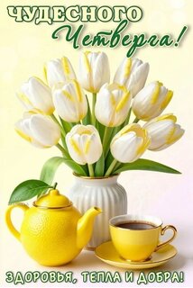 Красивая поздравительная открытка с букетом белых тюльпанов с желтыми полосками в белой вазе. Рядом расположены желтый чайник и чашка ароматного кофе или чая. На картинке надпись на русском языке: «Чудесного четверга!» сверху и «Здоровья, тепла и добра!» снизу. Светлая, солнечная и уютная композиция, идеально подходящая для отправки друзьям и близким в мессенджерах для поднятия настроения в четверг.