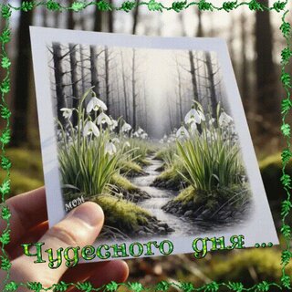 Красивая открытка с изображением весенних подснежников в лесу. На фото запечатлен момент, когда рука держит распечатанный снимок с нежными белыми цветами на фоне туманного леса и ручья. На переднем плане на русском языке нанесена надпись «Чудесного дня...». Изображение передает атмосферу пробуждения природы, свежести и весеннего настроения. Подходит для отправки в качестве доброго пожелания близким и друзьям в мессенджерах или социальных сетях.