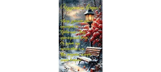 Чудесного вечера! Когда устанет день приходит он, привычный с виду долгожданный вечер. Он дарит нам спокойствие и он, так радуется каждой нашей встрече!