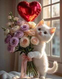 Котенок с букетом цветов и воздушным шариком в виде сердечка.