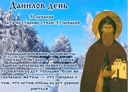 Данилов день 30 декабря. Дата по старому стилю: 17 декабря. Обращали внимание на приметы погоды. Считалось, что если на Данила на деревьях появится иней, то Святки будут тёплыми. Если же началась метель — это говорило о том, что летом пчёлы будут хорошо роиться.