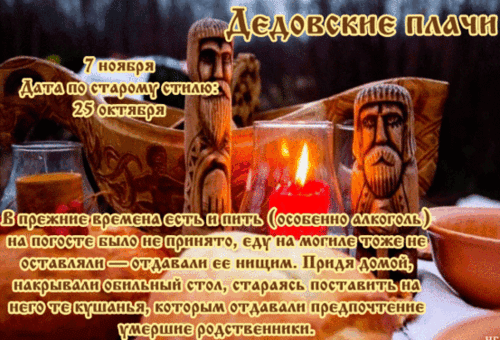 Дедовские плачи. 7 ноября. Дата по старому стилю: 25 октября. В прежние времена есть и пить (Особенно алкоголь) на погосте было не принято, еду на могиле тоже не оставляли - отдавали ее нищим. Придя домой, накрывали обильный стол, стараясь поставить на него те кушанья, которым отдавали предпочтение умершие родственники.
