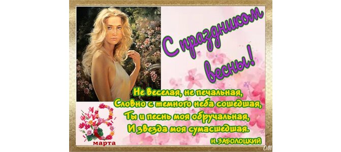 Теги:8 марта, женский день, любви, март, международный женский день, ольга марк, праздник, с 8 марта, с днем 8 марта, с международным лнем 8 марта, счастья, удачи, заболоцкий