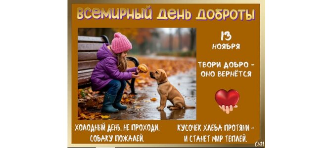 Всемирный день доброты 13 ноября Твори добро - оно вернётся. Холодный день - не проходи, собаку пожалей. Кусочек хлеба протяни - и станет мир теплей.