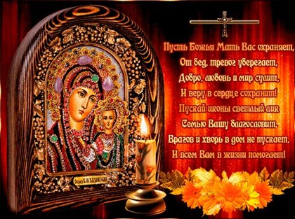 Пусть Божья Мать вас охраняет, от бед, тревог уберегает, добро, любовь и мир сулит, и веру в сердце сохранит! Пускай иконы светлый лик семью вашу благословит, врагов и хворь в дом не пускает, и всем вам в жизни помогает!