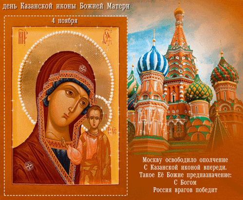 День Казанской иконы Божией Матери. 4 ноября. Москву освободило ополчение с Казанской иконой впереди. Такое Её Божие предназначение: С Богом Россия врагов победит