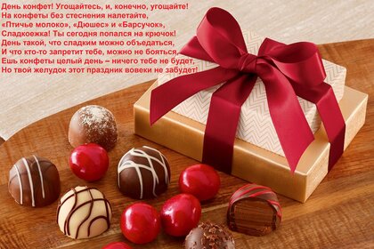 Открытка "День конфет! Угощайтесь, и, конечно, угощайте! На конфеты без стеснения налетайте, «Птичье молоко»,"
