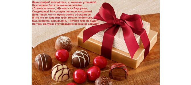 Теги:день конфет угощайтесь, конечно, угощайте на конфеты без стеснения налетайте, птичье молоко, дюшес и барсучок, сладкоежка ты сегодня попался на крючок день такой, что сладким можно объедаться, и что кто-то запретит тебе, можно не бояться, ешь конфеты целый день ничего тебе не будет, но твой желудок этот праздник вовеки не забудет