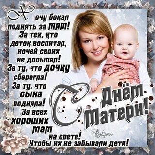 Хочу бокал поднять за МАМ! За тех, кто деток воспитал, ночей своих не досыпал! За ту, что дочку сберегла, за ту, что сына подняла! За всех хороших мам на свете, чтоб их не забывали дети! С днём Матери!