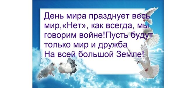 Открытка "День мира празднует весь мир, «Нет», как всегда, мы говорим войне! Пусть будут только мир и дружба Н"