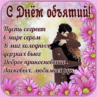 С днём объятий! Пусть согреет в мире сером в миг холодных, дерзких вьюг. Доброе прикосновение ласковых, любимых рук.