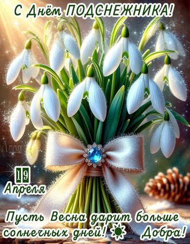 Красивая поздравительная открытка с букетом белоснежных подснежников. На изображении изображен пышный букет первоцветов, перевязанный элегантной атласной лентой с блестящей брошью с голубым камнем. На картинке присутствует праздничная надпись на русском языке: «С Днем подснежника!» и пожелание «Пусть Весна дарит больше солнечных дней! Добра!». В левом нижнем углу указана дата — 19 апреля. Изображение наполнено солнечным светом, мерцанием и весенним настроением, идеально подходит для отправки друзьям и близким в качестве весеннего поздравления.