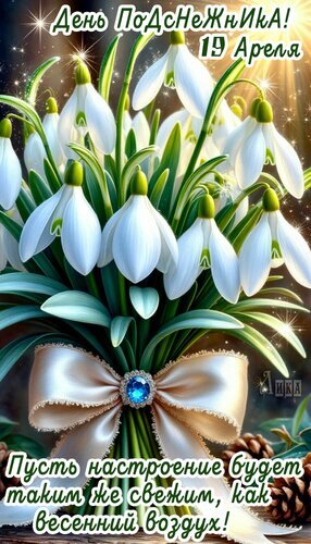 Красивая поздравительная открытка к Дню подснежника (19 апреля). На изображении представлен пышный букет белоснежных подснежников с зелеными стеблями, перевязанный изящной атласной лентой с блестящей брошью. В верхней части надпись «День Подснежника! 19 апреля», а в нижней — теплое пожелание: «Пусть настроение будет таким же свежим, как весенний воздух!». Изображение наполнено солнечными бликами и весенним настроением, идеально подходит для поздравления близких с приходом весны.