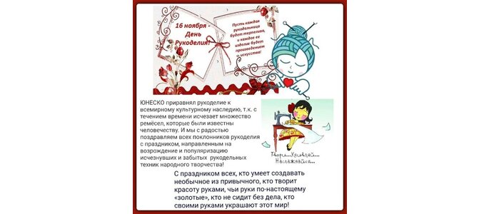16 ноября - День Рукоделия! Пусть каждая рукодельница будет терпелива, и каждое ее изделие будет произведением искусства! Юнеско приравнял рукоделие к всемирному культурному наследию, т. к. с течением времени исчезает множество ремёсел, которые были известны человечеству. И мы с радостью поздравляем всех поклонников рукоделия с праздником, направленным на возрождение и популяризацию исчезнувших и забытых рукодельных техник народного творчества! Твори... Удивляй... Наслаждайся... С праздником всех,