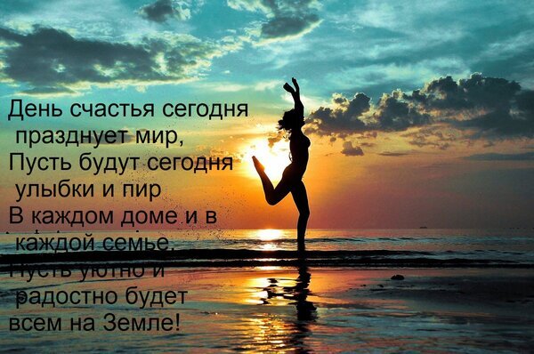 Открытка День счастья сегодня празднует мир, Пусть будут сегодня улыбки и пир В каждом доме и в каждой семье,
