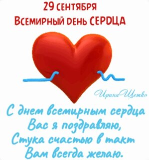 29 сентября Всемирный день сердца. С днем всемирным сердца вас я поздравляю, стука счастью в такт Вам всегда желаю.