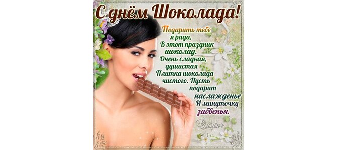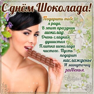 С днём шоколада! Подарить тебе я рада в этот праздник шоколад. Очень сладкая, душистая плитка шоколада чистого. Пусть подарит наслажденье и минуточку забвенья.