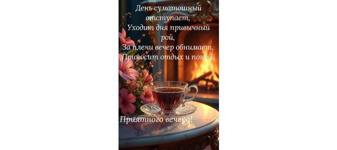 Открытка "День суматошный отступает, уходит дня привычный рой, за плечитвечер обнимает, приносит отдых и покой"
