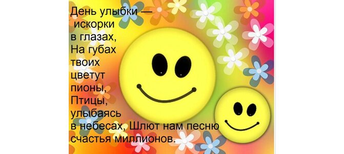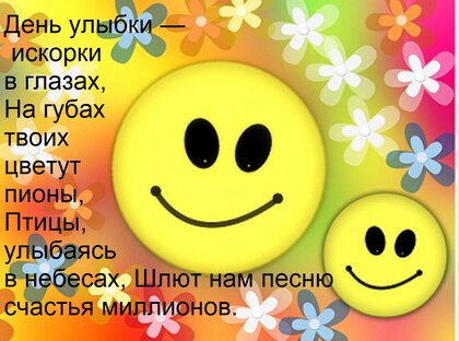 Открытка "День улыбки — искорки в глазах, на губах твоих цветут пионы. Птицы, улыбаясь в небесах, шлют нам..."