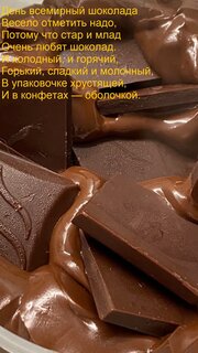 Теги:день всемирный шоколада весело отметить надо, потому, что, стар, млад, очень, любят, шоколад, холодный, и горячий, горький, сладкий и молочный, в упаковочке хрустящей