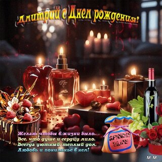 на столе торт, свечи, вино, мешочек приношу удачу. Дмитрий с днем рождения! и пожелания