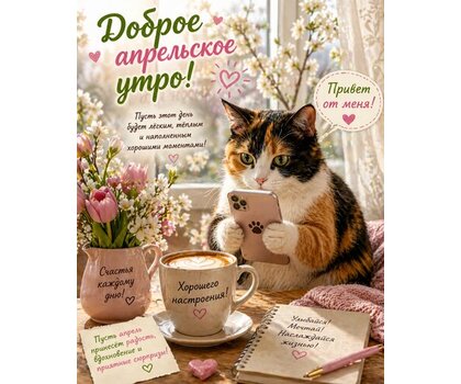 Красивая открытка с пожеланием доброго апрельского утра. На изображении очаровательная трехцветная кошка, смотрящая в смартфон, рядом стоит чашка ароматного капучино с латте-артом и нежные весенние цветы: тюльпаны и мимоза. Атмосферное и уютное фото наполнено теплом, нежностью и весенним настроением. Идеально подходит для отправки друзьям и близким в качестве доброго пожелания хорошего дня и отличного настроения в апреле.