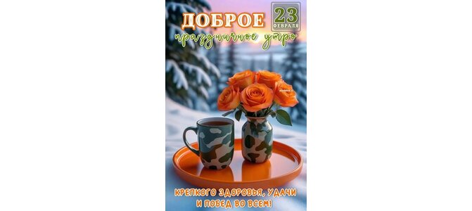 Открытка "ДОБРОЕ ПРАЗДНИЧНОЕ УТРО. 23 ФЕВРАЛЯ. КРЕПКОГО ЗДОРОВЬЯ, УДАЧИ И ПОБЕД ВО ВСЕМ!"