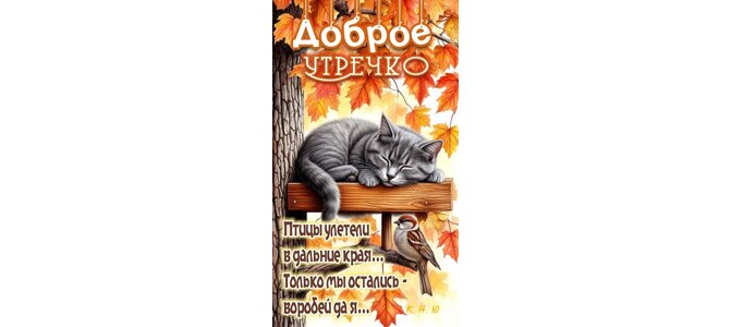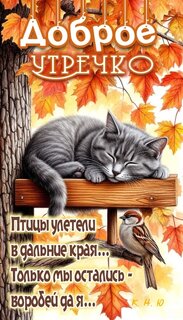 Теги:доброе утро, осеннее утро, позитив, кот и воробей, открытка утренняя