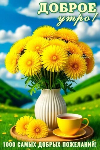 Красочное и позитивное изображение для доброго утра: пышный букет ярко-желтых одуванчиков в белой вазе на фоне солнечного летнего пейзажа с зелеными холмами и голубым небом. Рядом на подносе стоит чашка ароматного чая. Идеально подходит для открыток, пожеланий хорошего дня, статусов в соцсетях и создания праздничного летнего настроения. Качественная картинка с надписью «Доброе утро!» и пожеланиями тепла и радости.