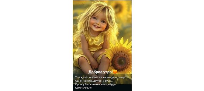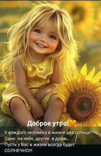 Доброе утро! У каждого человека в жизни два солнца: одно на небе, другое в душе... Пусть у Вас в жизни всегда будет солнечно!