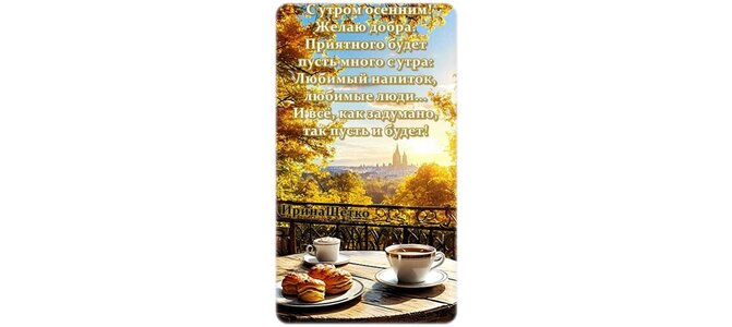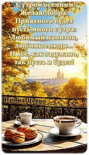 С утром осенним! Желаю добра. Приятного будет пусть много с утра: любимый напиток, любимые люди... И всё, как задумано, так пусть и будет!