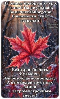 За окном ноябрь и хмуро, только ты не унывай. Замечательное утро в нежности лучах встречай! Если день начать с улыбки, он безоблачно пройдет, а от мыслей грустных блики с ветром встречным унесет!