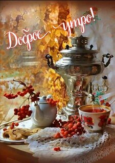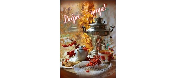 Около окна на столике стоит самовар, чашка с горячим чаем, тарелочка с печеньем и всë это украшено веточками рябины с красными ягодами.