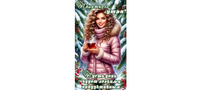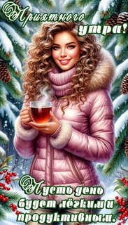 Теги:доброе утро, добрый день, зима, снег, ель, елка, девушка, чай, чашка чая, красивое пожелание, красивая картинка, ягоды, легкого дня