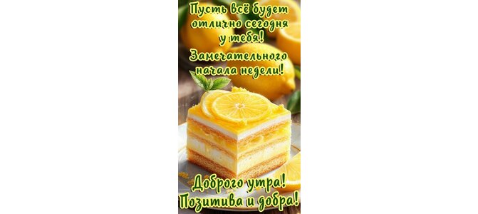 Теги:доброе утро, понедельник, вторник, дни недели, пироженка, пирожное, лимон, про удачу, отличной недели, отличного дня, пожелания на каждый день