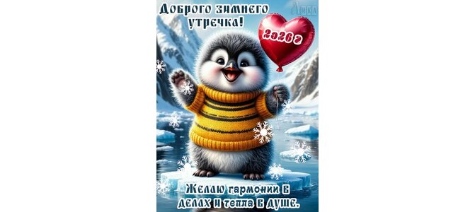 Теги:доброе утро, утро, гармонии в делах, тепла в душе, снег, зима, пингвин, шарик, сердечко, снежинки, пожелания на каждый день