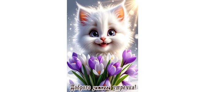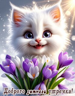 Теги:доброе утро, утро, пушистик, котенок, белая кошка, цветы, крокусы, зима, весна, красивая картинка, пожелания на каждый день