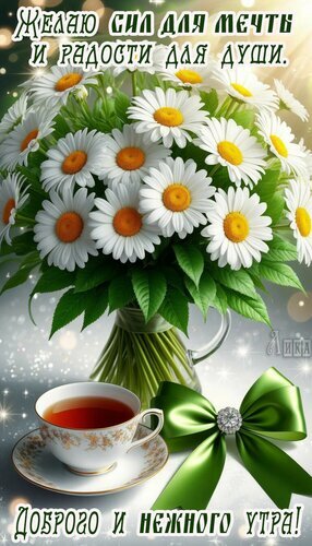 Теги:доброе утро, утро, цветы, ромашки, чай, бантик, доброго и нежного утра, радости, испонения мечты, пожелания на каждый день, красивая картинка
