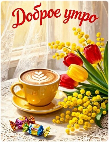 Уютная и солнечная открытка с пожеланием доброго утра. На композиции изображена чашка аппетитного капучино с красивым рисунком латте-арт, яркие красные и желтые тюльпаны, а также нежные веточки мимозы. Рядом на кружевной скатерти лежат конфеты в ярких обертках. Теплый солнечный свет проникает сквозь тюль, создавая атмосферу радости, нежности и весеннего настроения. Идеально подходит для отправки близким в качестве доброго утреннего приветствия.
