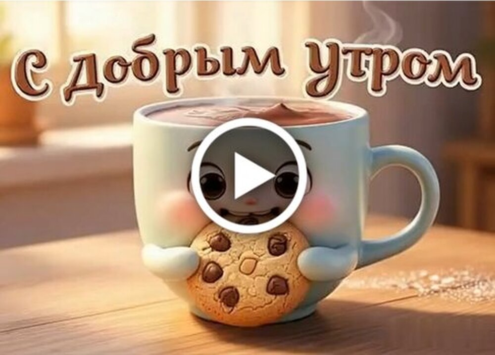 Милое и позитивное видео для хорошего начала дня. В центре внимания находится очаровательный антропоморфный персонаж в виде голубой кружки с добрым лицом и большими глазами. Персонаж уютно обнимает большую шоколадную печеньку на фоне теплого утреннего света. Видео сопровождается надписью С добрым утром что создает атмосферу уюта и радости. Это идеальное видео для того чтобы отправить близким или друзьям и пожелать им прекрасного настроения с самого утра.