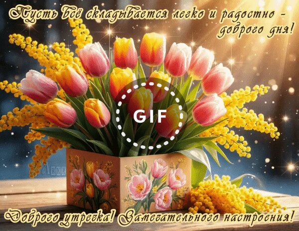 Теги:доброе утро, утро, гифка, анимация, добрый день, удачи, цветы, тюльпаны, мимоза, позитива, радости, пусть все легко складывается, красивая анимация