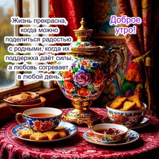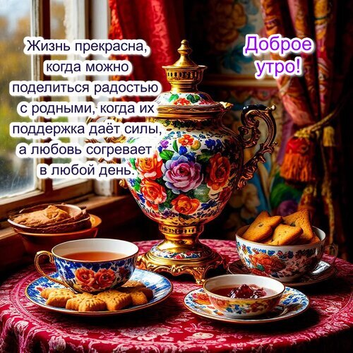 Теги:жизнь, прекрасна, доброе утро, с добрым утром, доброго утра, самовар, пожелания, открытка, чай, семья, любовь, поддержка, мотивация