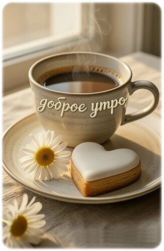 Уютная и теплая открытка для доброго утра. На снимке изображена чашка горячего дымящегося кофе на блюдце, рядом с которой лежит нежное сердце-печенье и распускается белый цветок маргаритки. Композиция наполнена мягким утренним светом, создающим атмосферу спокойствия, нежности и романтики. Идеально подходит для отправки близким, чтобы пожелать прекрасного начала дня и поднять настроение.