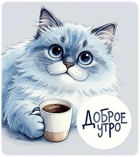 Милая цифровая иллюстрация пушистого голубого котенка, который держит в лапке чашку горячего кофе. Картинка выполнена в мягких акварельных тонах с детализированной текстурой шерсти. На изображении присутствует надпись «ДОБРОЕ УТРО», что делает этот арт идеальным для поздравительных открыток, статусов в соцсетях и пожеланий хорошего начала дня. Эстетичное и уютное изображение, вызывающее положительные эмоции.