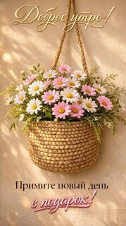 Красивая поздравительная открытка на тему «Доброе утро!». На изображении представлена плетеная корзина с пышным букетом нежных розовых и белых ромашек, залитая мягким солнечным светом. В верхней части картинки каллиграфическая надпись «Доброе утро!», а в нижней — вдохновляющая фраза «Примите новый день в подарок!». Идеально подходит для отправки близким, друзьям и коллегам в мессенджерах (WhatsApp, Viber) или социальных сетях, чтобы пожелать прекрасного начала дня и хорошего настроения. تتميز теплым, уютным и эстетичным стилем.